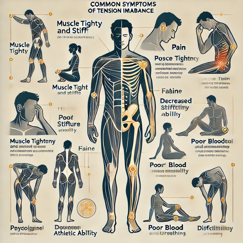 張力失衡引起的疼痛可以是局部的(例如某些特定肌肉或關節的疼痛)或廣泛的(例如全身性的酸痛)。這種疼痛通常在活動增加時加劇,並且在早晨或長時間靜止後最為明顯。下背部、頸部、肩膀和膝蓋等部位是常見的疼痛區域。
